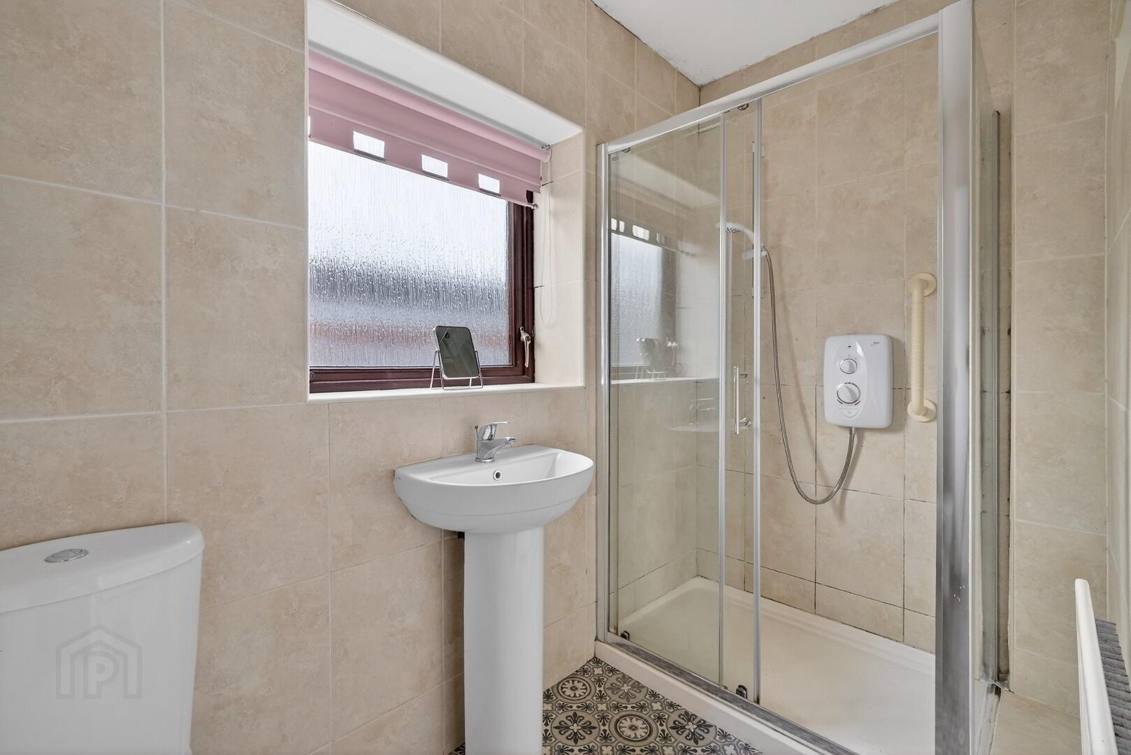 Full wall tiled bathroom with an extended shower enclosure with an electric shower. White low flush wc with matching wash hand basin. Lino Flooring
