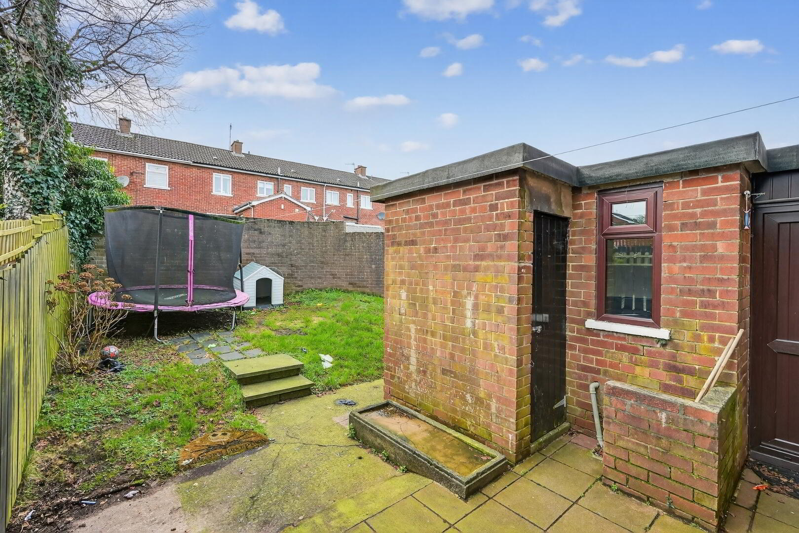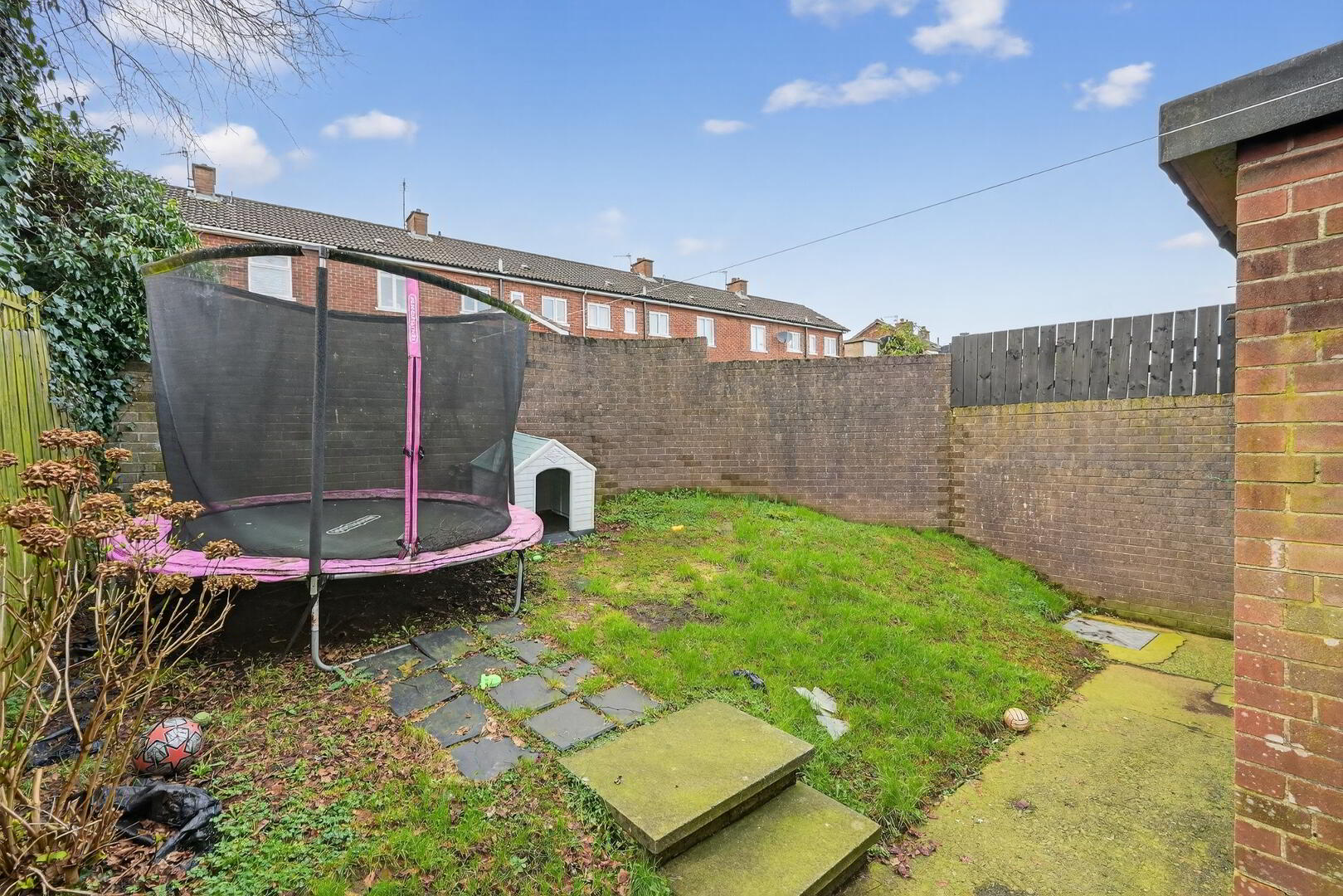 Rear/Side garden: An enclosed corner site with a brick paver patio area and lawn garden. Brick Shed.
