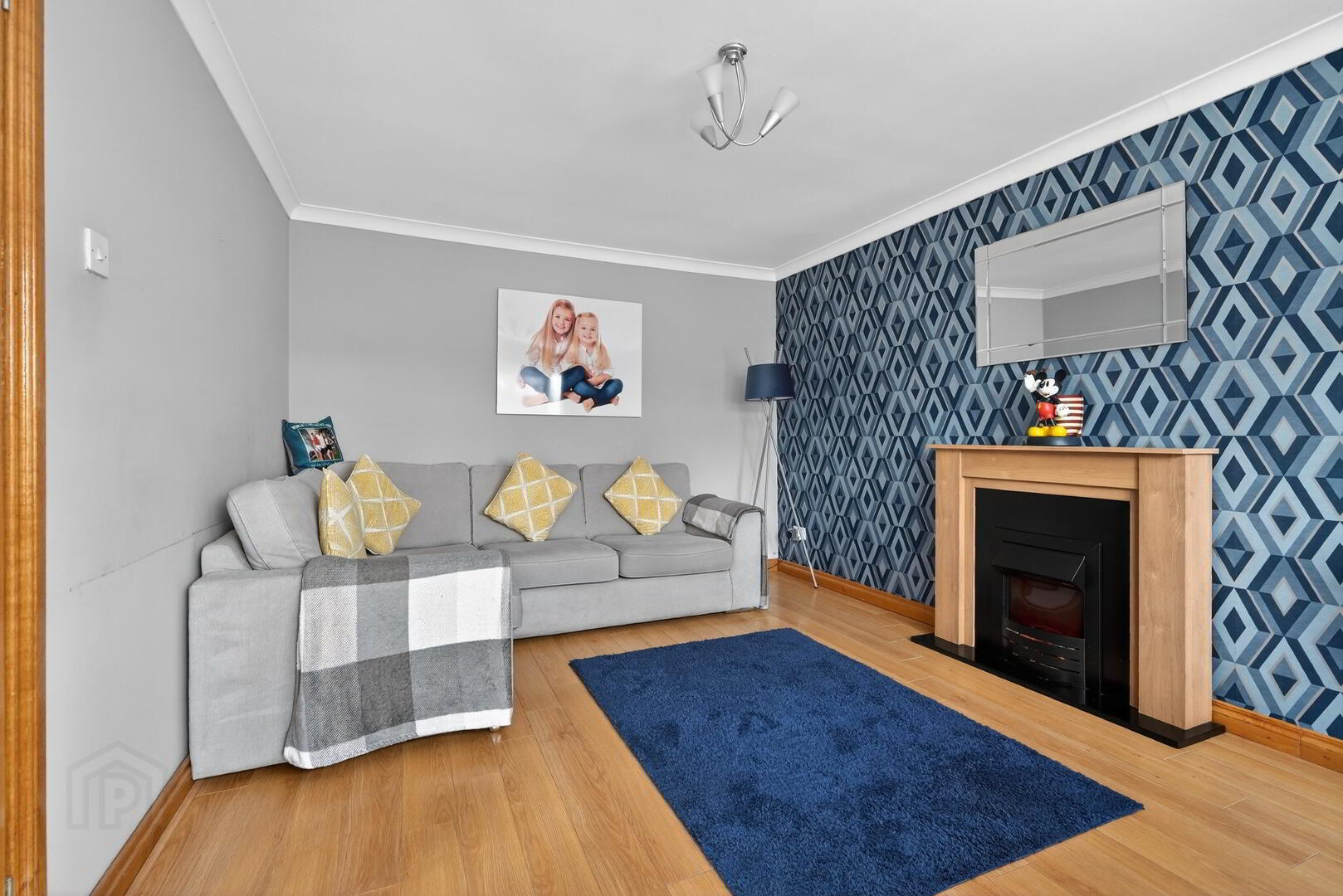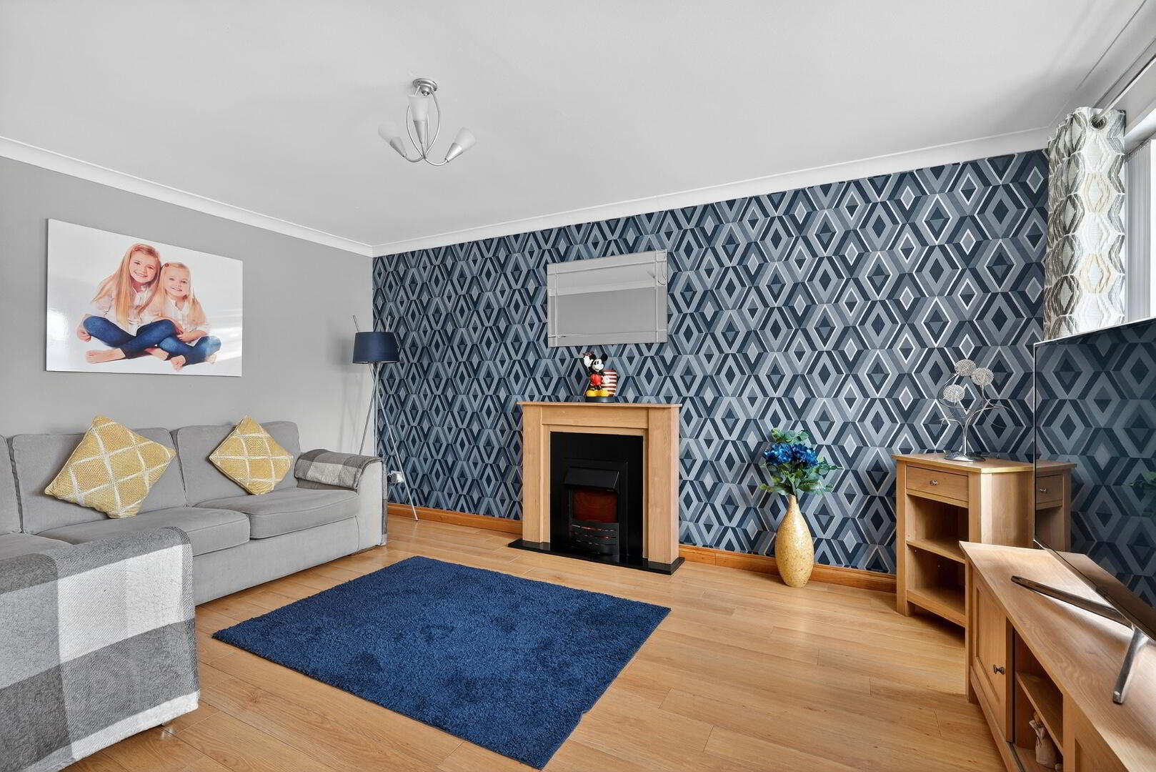 The generously proportioned living room features a large front facing window that floods the space with natural light, complemented by a stylish flooring and a contemporary feature fireplace, creating a warm and relaxing environment, ideal for both everyday living and entreating guests