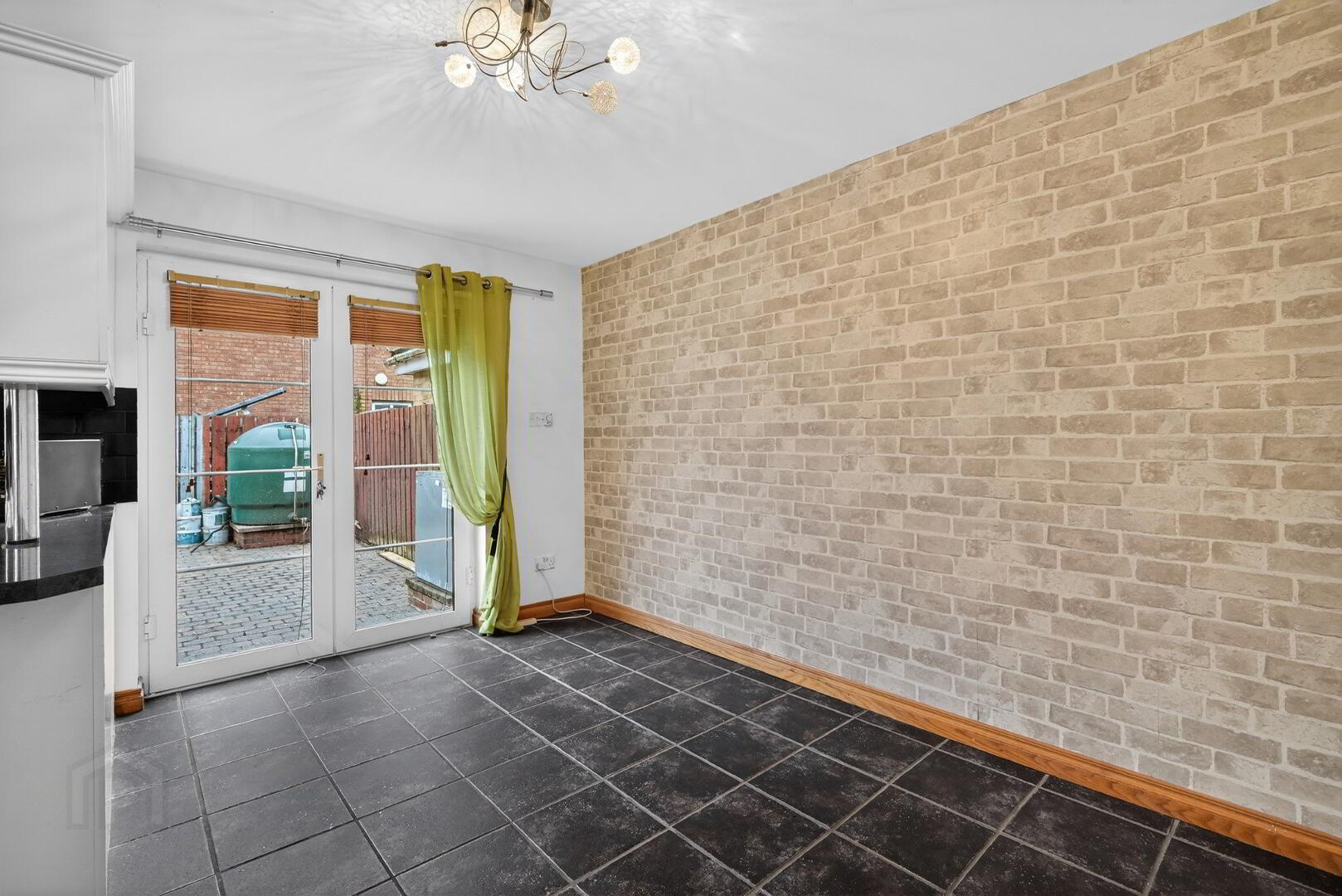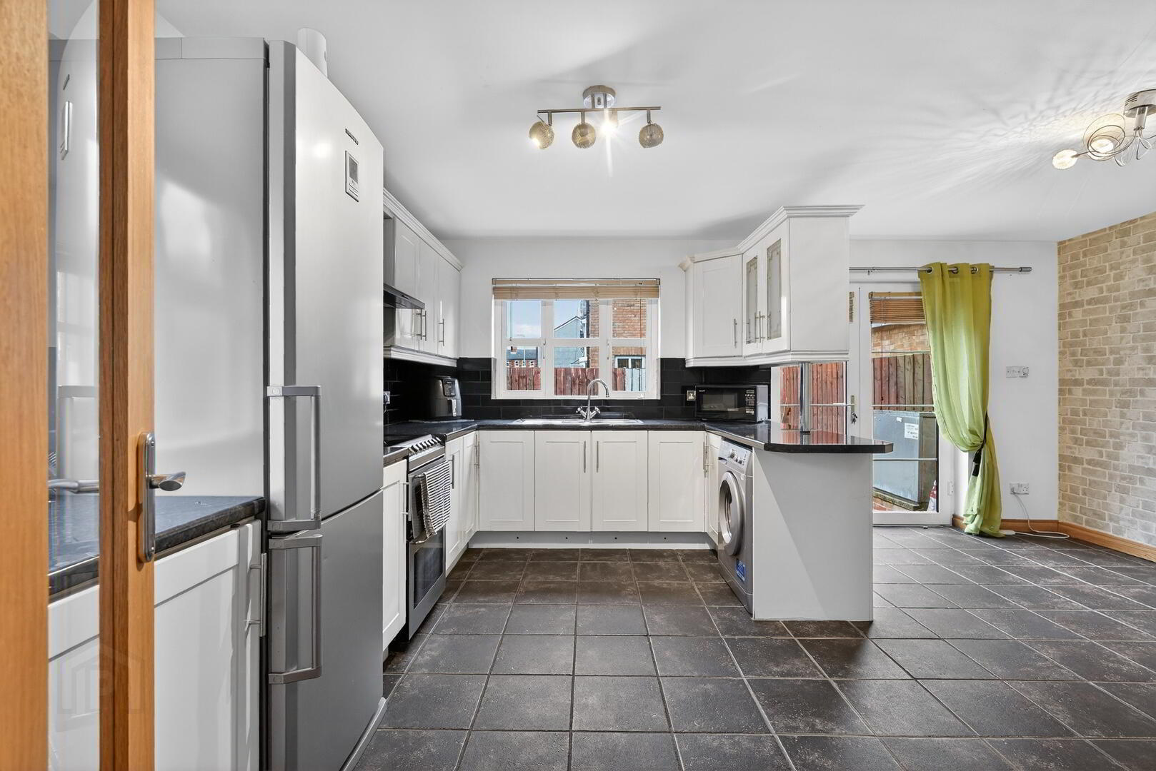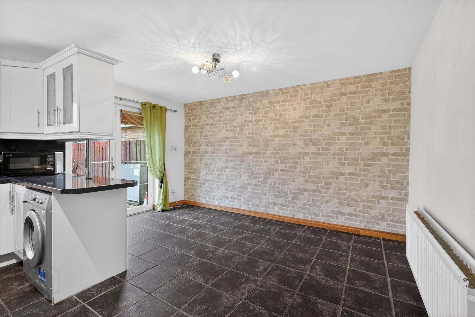 A range of high and low level units with formica worktops. Cooker space, fridge freezer space, plumbed for washing machine and tiled flooring leading to a spacious dining area with patio doors to a private rear garden and driveway.