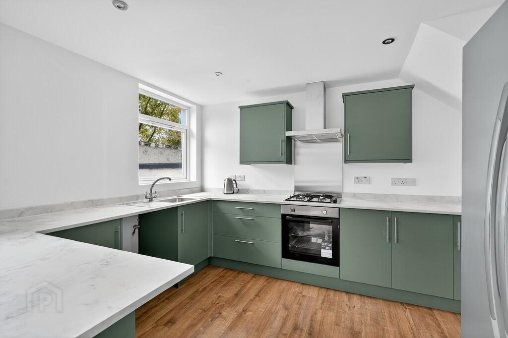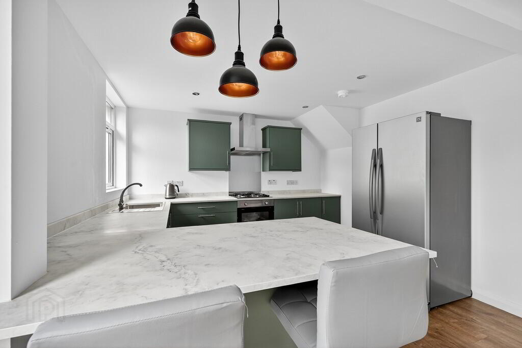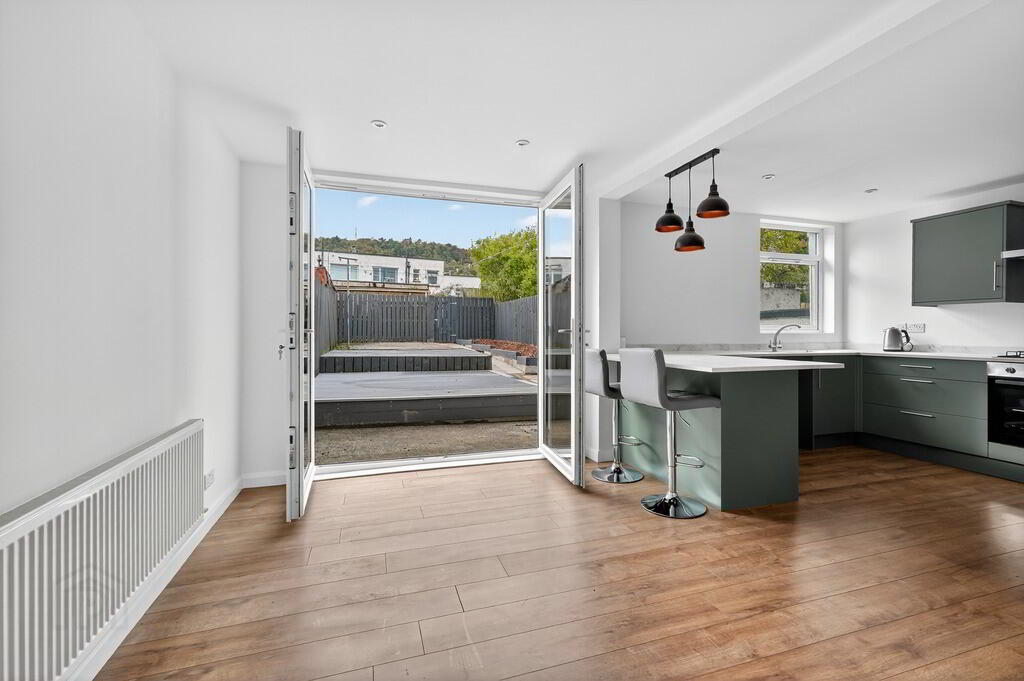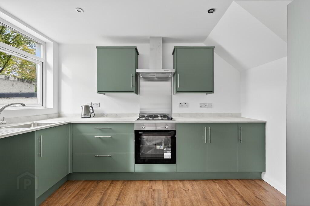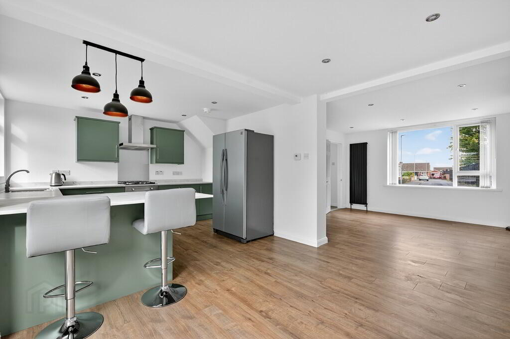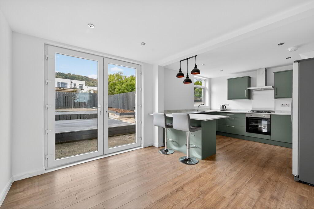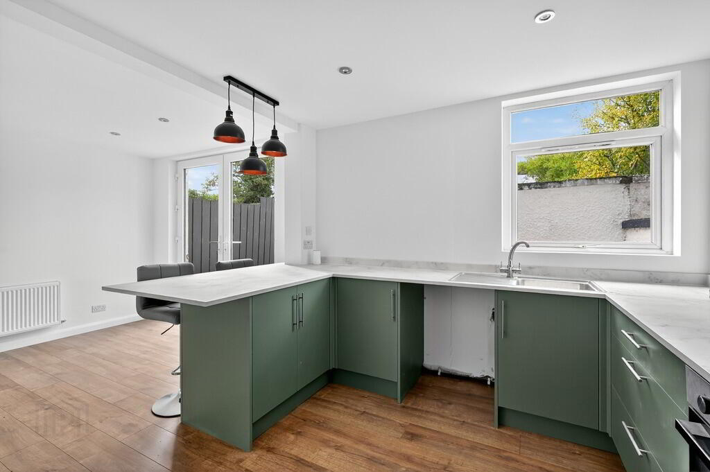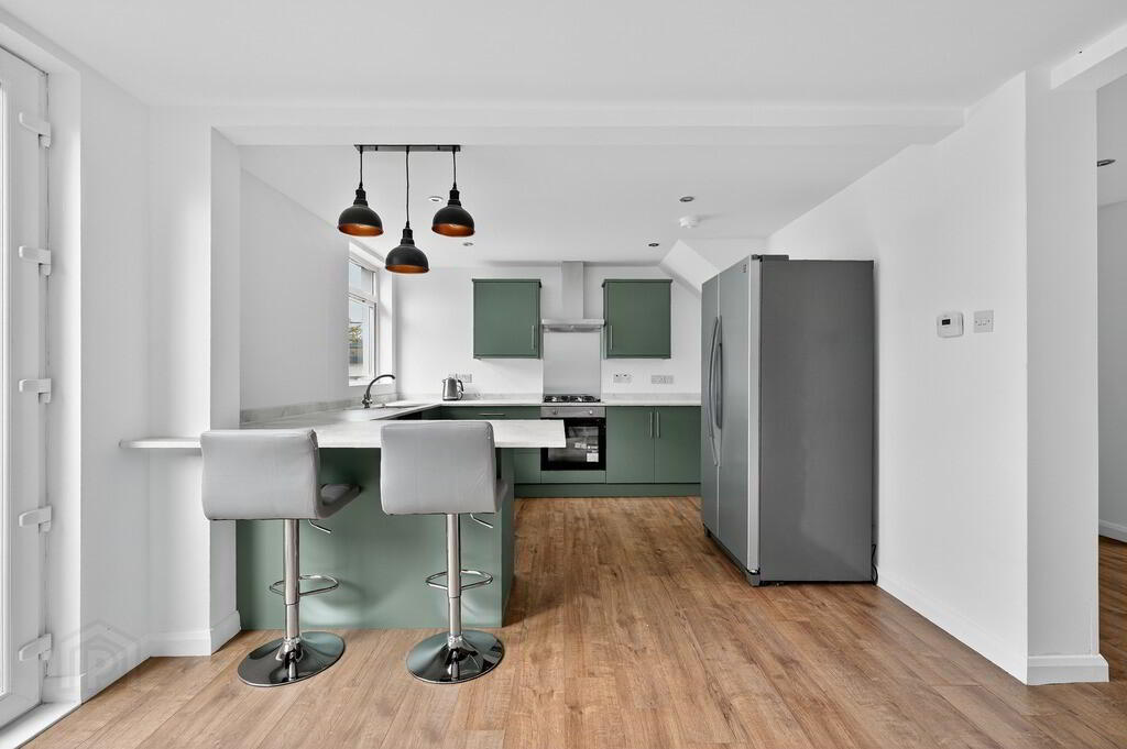 Open Plan Stylish sage-green cabinetry with sleek intergrated appliances with breakfast bar and ample storage . Large patio doors allowing natural light