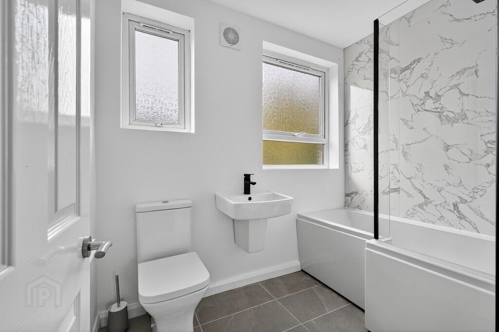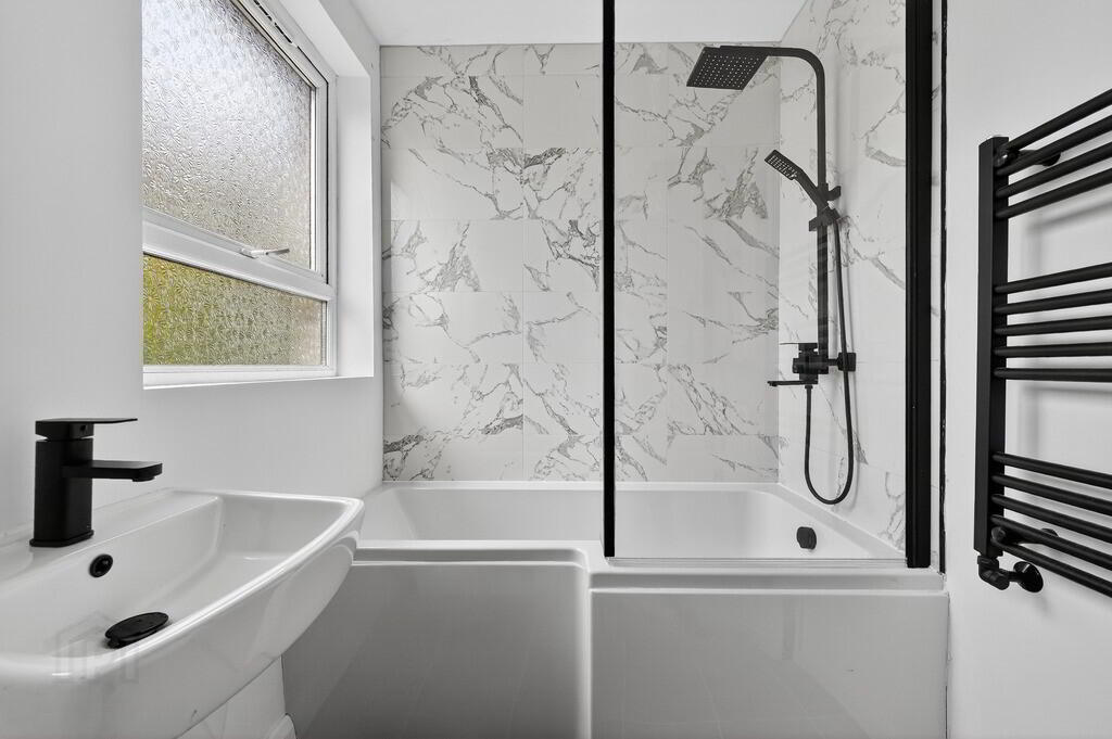 Panelled bath with glass shower screen and overhead shower. Stylish marble-effect wall tiling around bath. Low flush WC and matching black fittings for modern contrast.