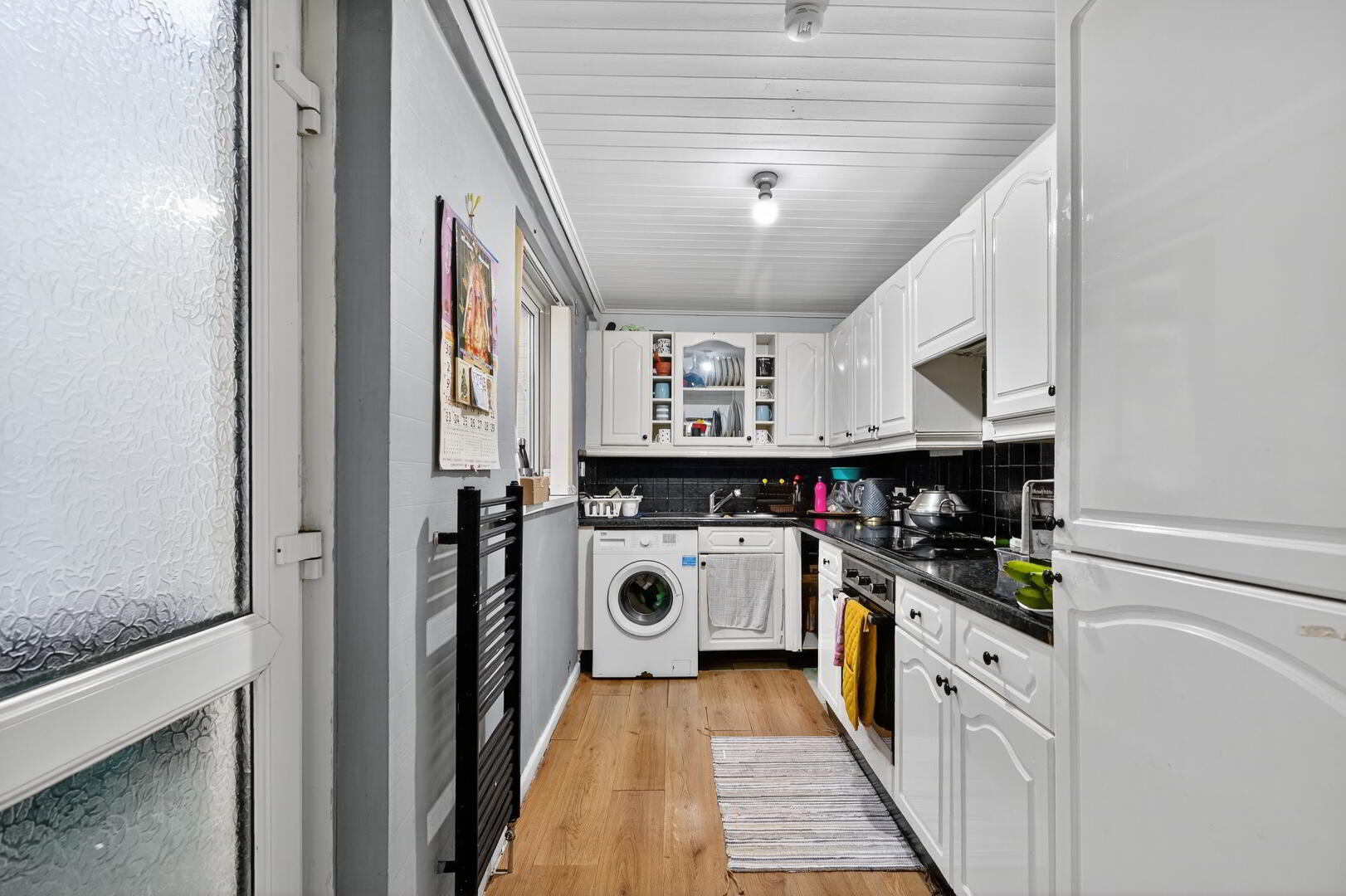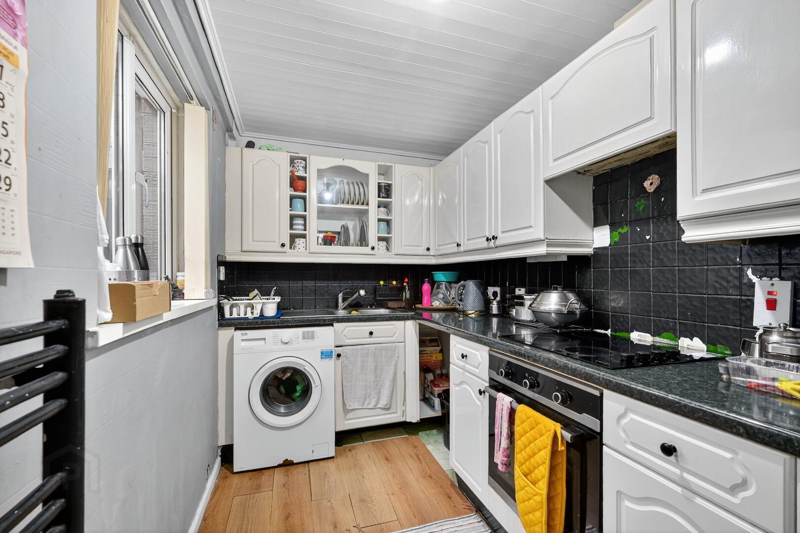 Modern fitted white Kitchen with an arrange of both high and low level units. Formica worktops. Built in oven and hob with extractor fan. Stainless steel sink with mono tap. Plumbed for washing machine. Fridge Freezer housing. Wood laminated flooring. Pvc white panelled ceiling.