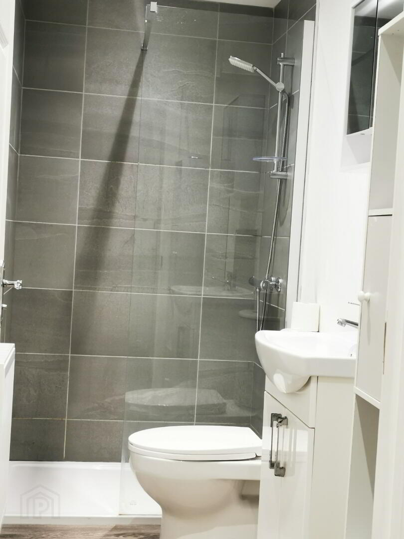 Recently installed bathroom suite featuring a spacious, fully tiled walk-in shower, wash hand basin, and WC